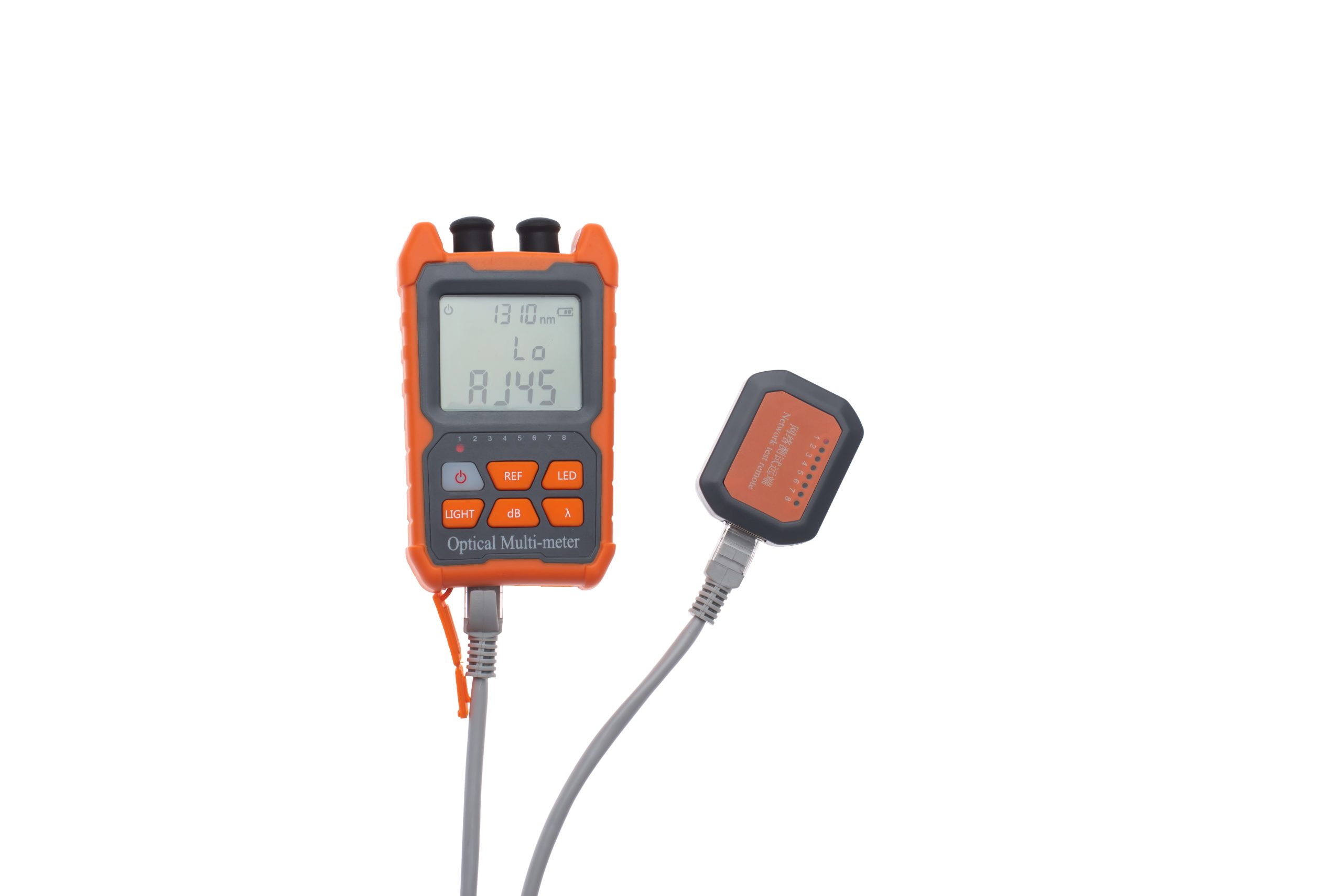 The NK200 Mini Optical Power Meter and Visual Fault Locator (VFL) All-in-One Series features a single-chip microprocessor control system with comprehensive functionality. The ergonomic body design utilizes advanced thermoplastic molding technology for durability and aesthetic appeal. Built-in detectors and lasers are well-protected within the enclosure. The device includes auto power-off, three red light modes, backlight display, wavelength memory function, optical working frequency identification (optional), user calibration support, wide testing range, illumination support, and RJ45 wire sequence testing capability.