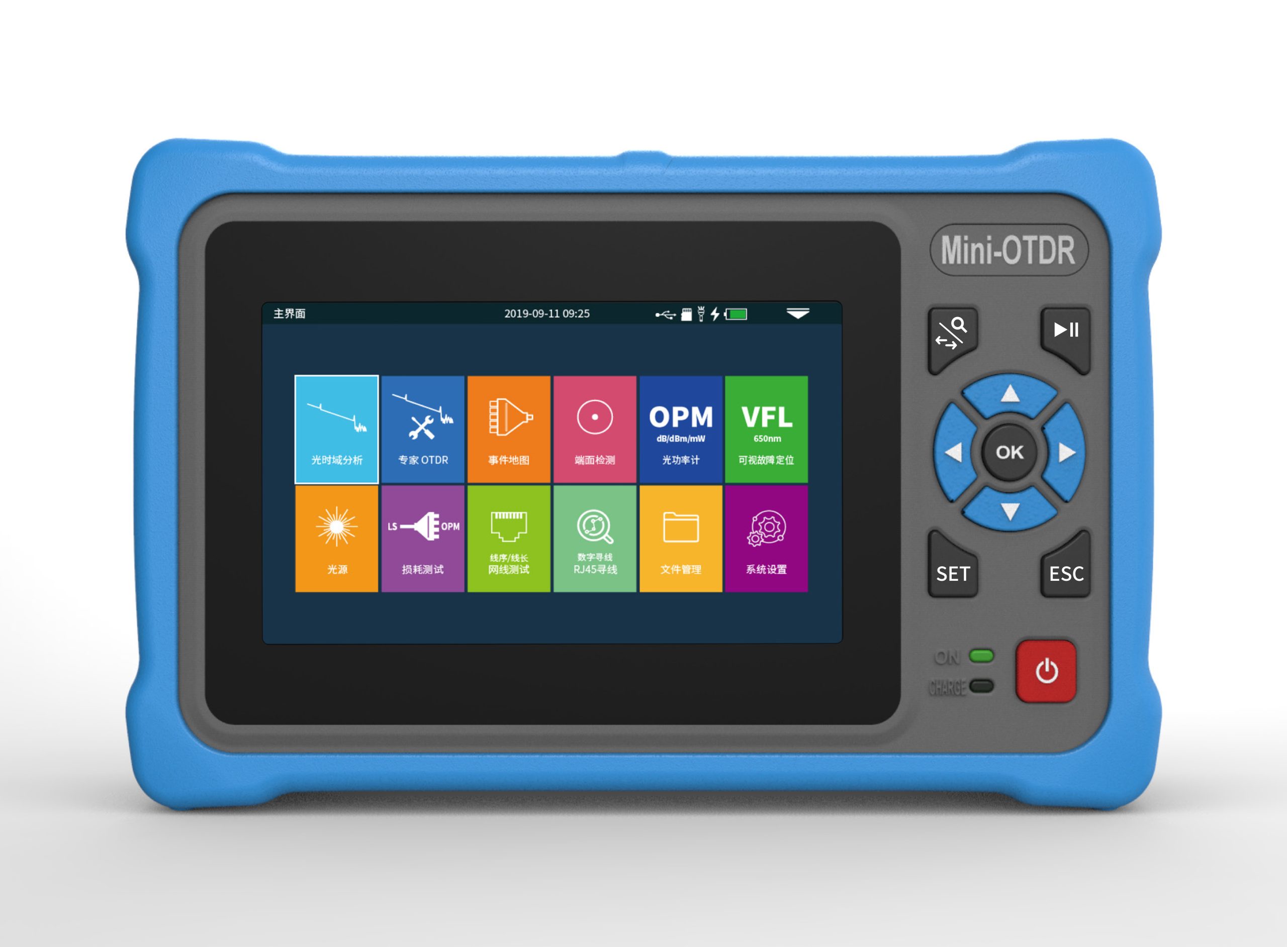 The OTDR offers a maximum dynamic range of up to 26 dB, enabling accurate testing up to 100 km. Equipped with 8 GB internal memory, it can store over 200,000 test traces. A 4000 mAh high-density lithium polymer battery with intelligent power management delivers over 8 hours of continuous operation at high brightness and supports power bank charging and operation.